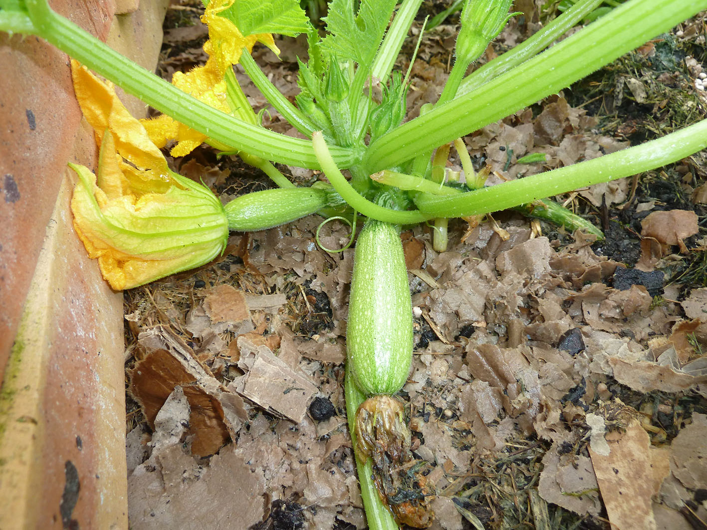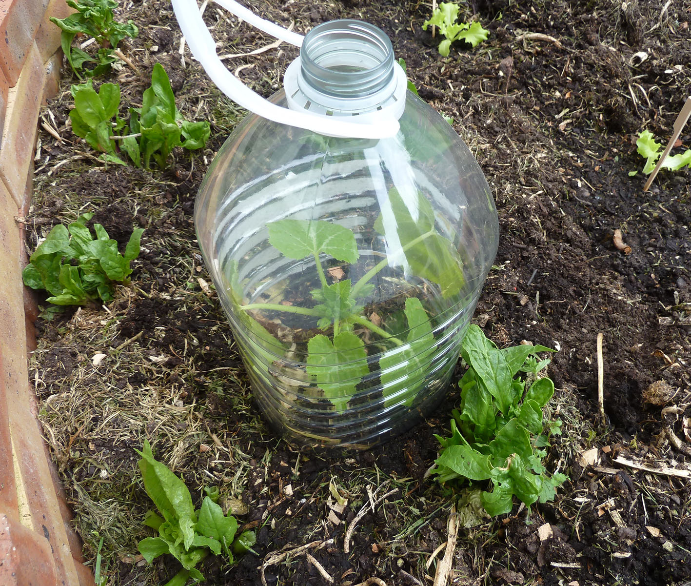 En revanche, le semis de courgette a été réalisé trop tôt dans la saison : la plantule a grandi très vite et surtout, a filé par manque de lumière. Une fois rempoté, le pied a continué à se développer très rapidement jusqu’à dépasser la capacité du pot de culture (les racines sortaient du récipient). Le pied de courgette a dû être transplanté dans le micro potager aux alentours du 20 mars, ce qui reste très tôt pour la saison, même à Toulouse. Tous les soirs, il a été couvert par une cloche (un bidon d’eau dont le fond a été découpé) et par un voile d’hivernage.