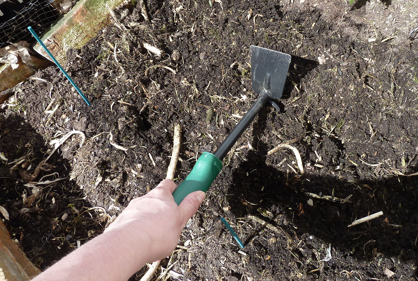 La moutarde a été coupée début février et laissée en couverture de l’espace de culture. Début mars, le compost, arrivé à maturité, a été étalé sur l’espace de culture et mélangé à la terre, avec les résidus des plants de moutarde. Le sol a été laissé au repos et sans couverture durant tout le mois de mars, permettant ainsi, aux premiers rayons de soleil, de réchauffer la terre et de relancer l’activité biologique du sol.