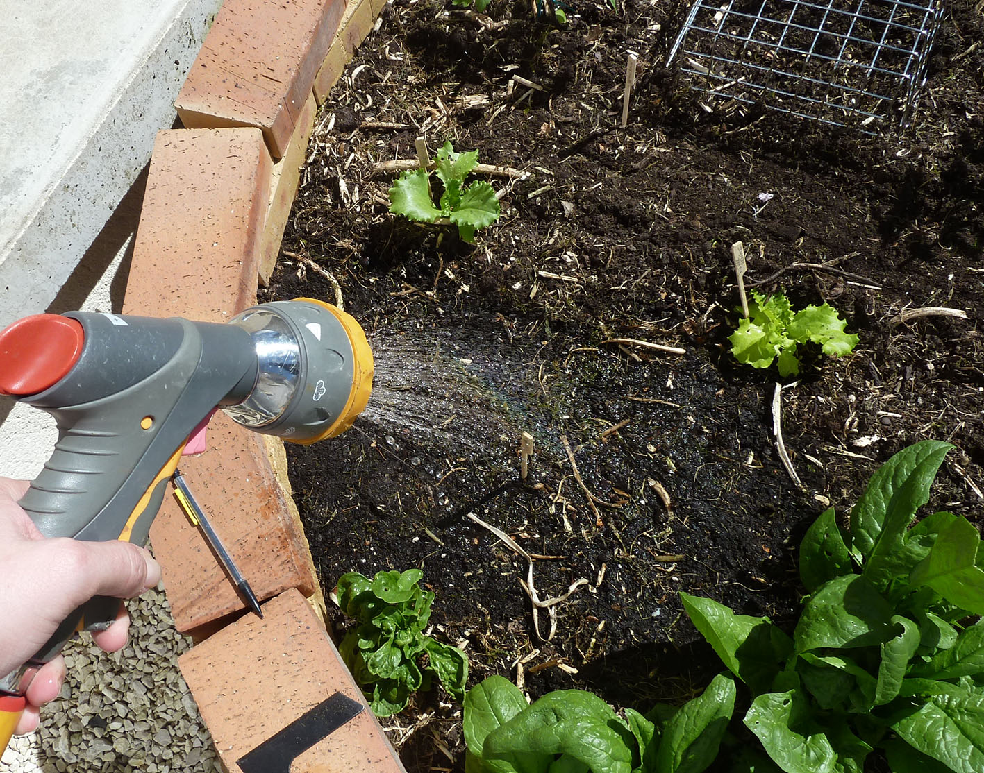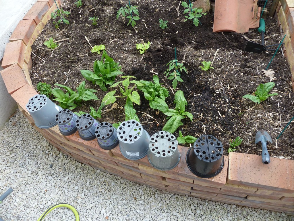 Fin mars, les plants de tomate et les laitues ont été installés à côté des épinards, culture d’hiver maintenue en place jusqu’aux premières grosses chaleurs.