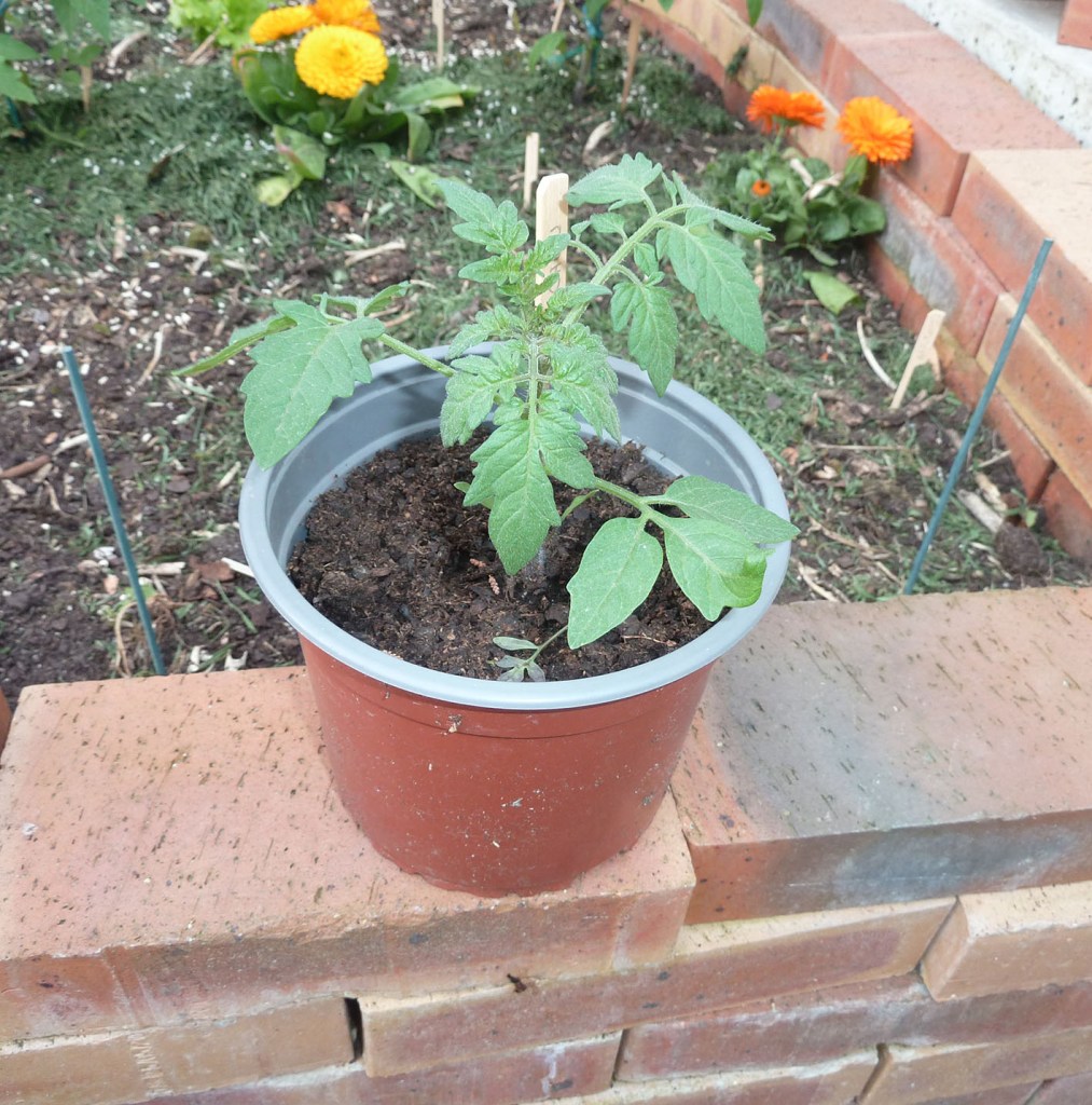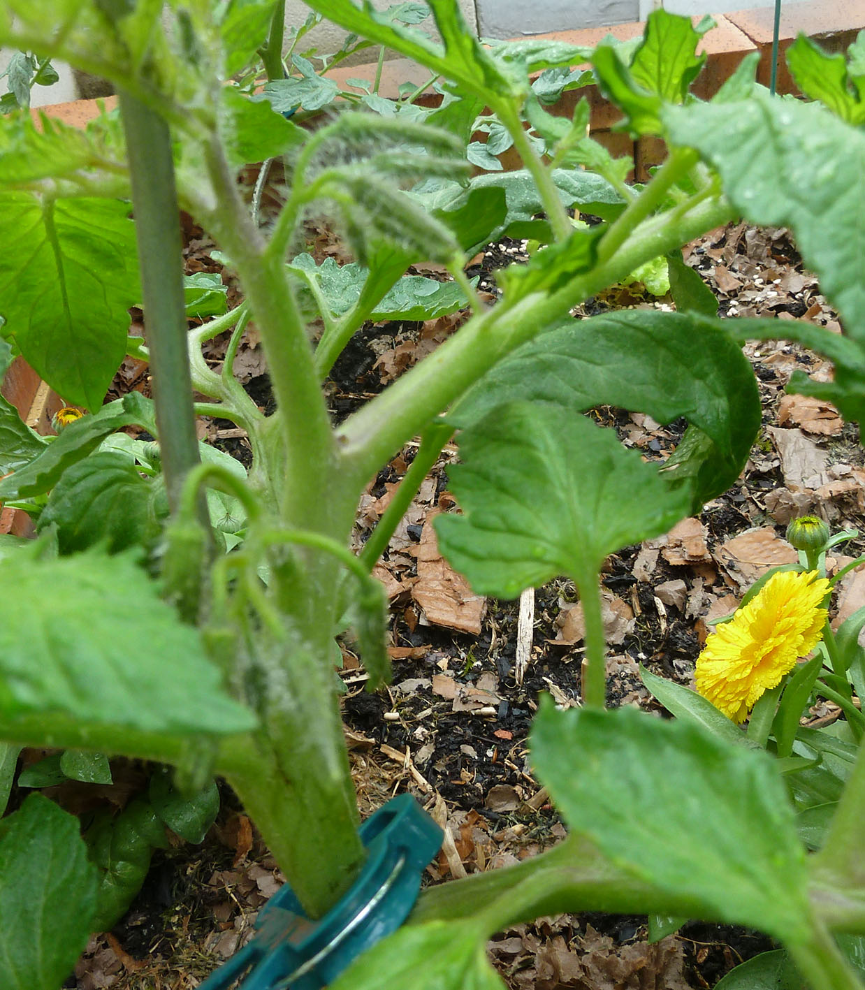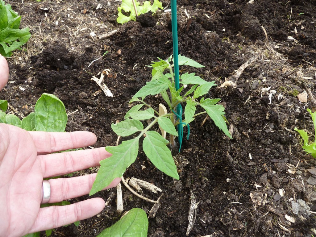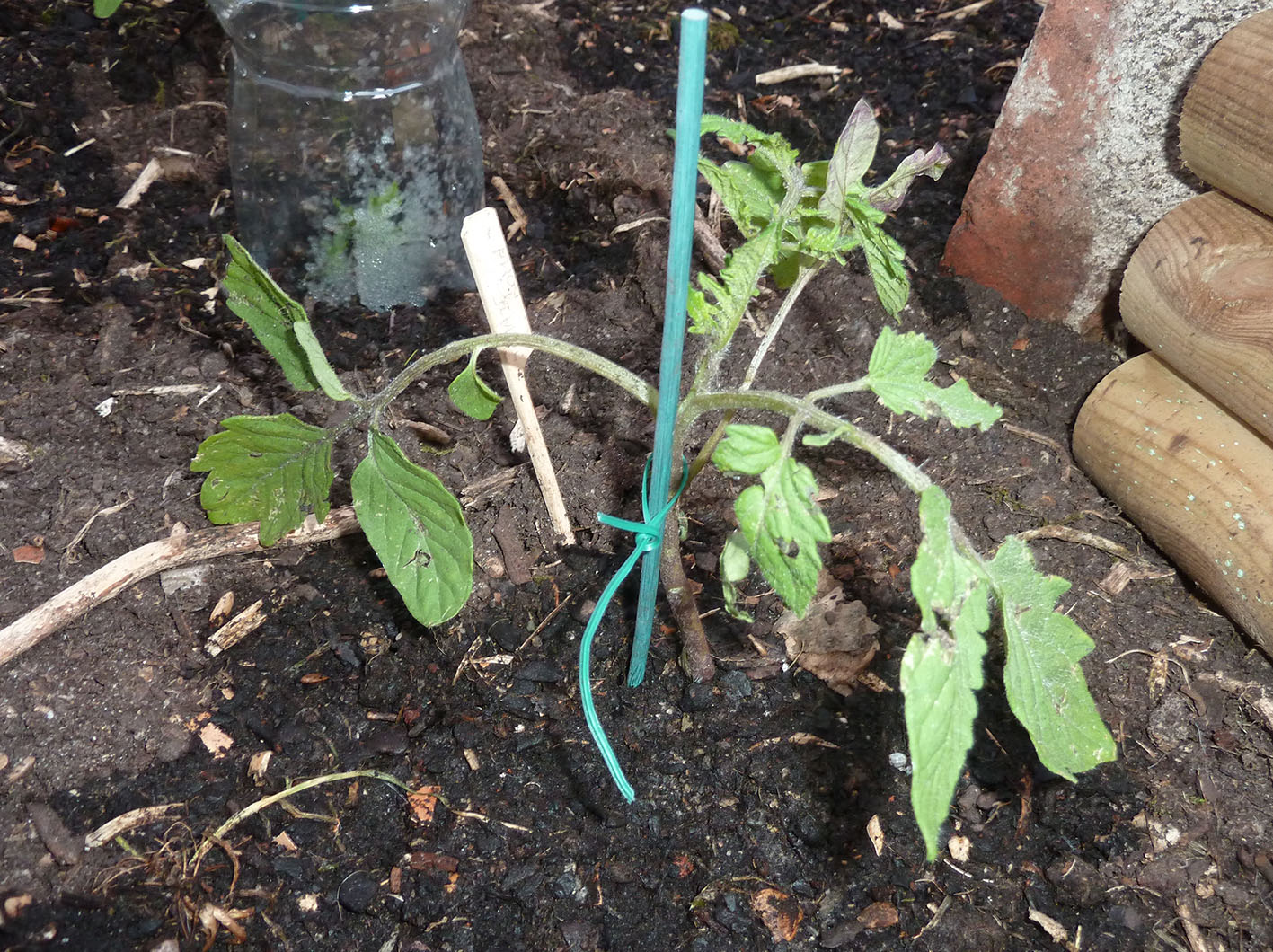 Un pied de tomate a été déterré par notre assistant jardinier… Remis en terre, arrosé et accroché à un tuteur, le plant de Roma a survécu. Néanmoins, le stress occasionné a retardé sa croissance.