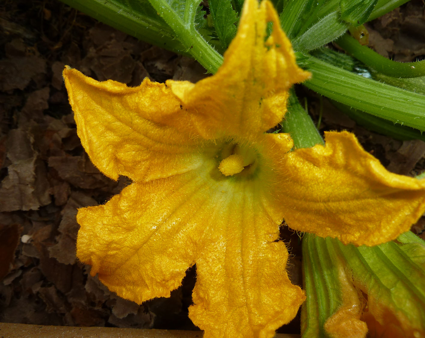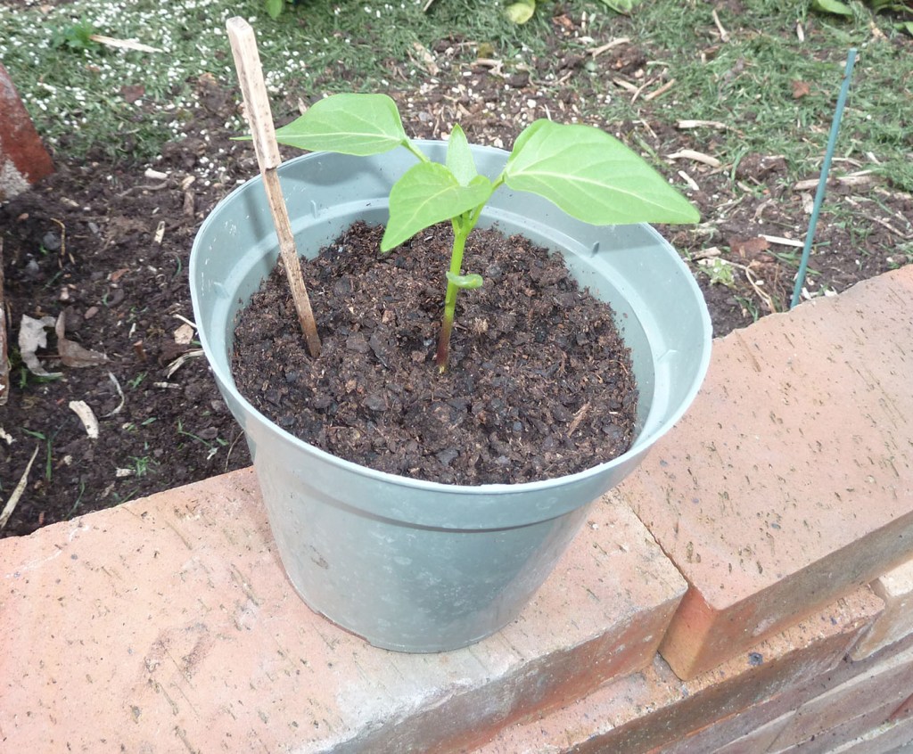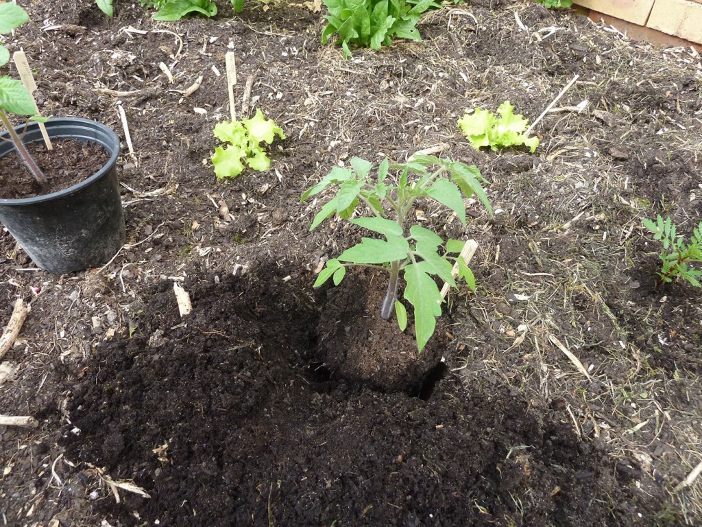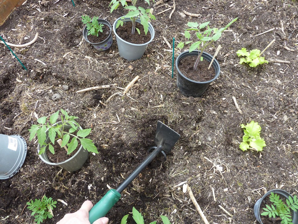 Un pied de tomate a été déterré par notre assistant jardinier… Remis en terre, arrosé et accroché à un tuteur, le plant de Roma a survécu. Néanmoins, le stress occasionné a retardé sa croissance.