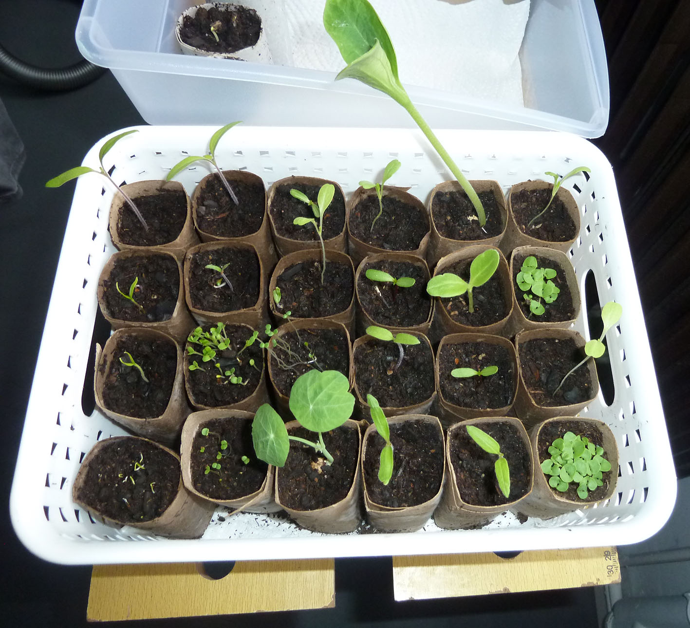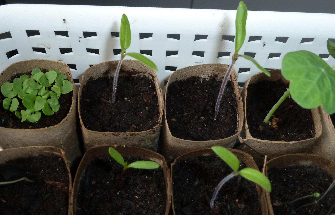 Toutes les graines semées en tubes, au mois de février, ont germé et produit des plantules. Néanmoins, les plants installés derrière une fenêtre ont manqué un peu de lumière. Par exemple, le pied de courgette et les semis de laitues ont filé, à cause d’une luminosité trop faible. Le « filage » des plants a pu être rattrapé par un rempotage précoce.