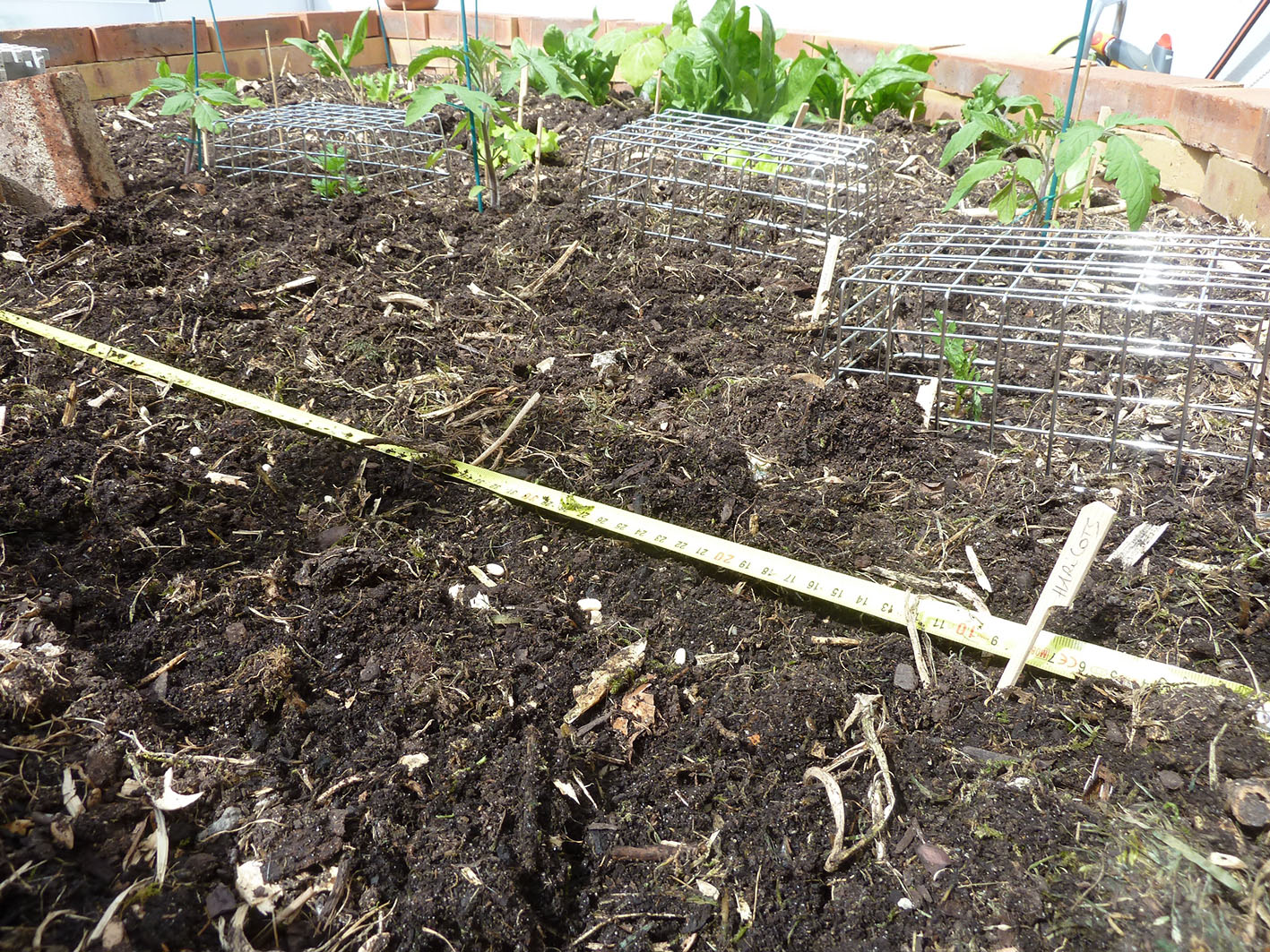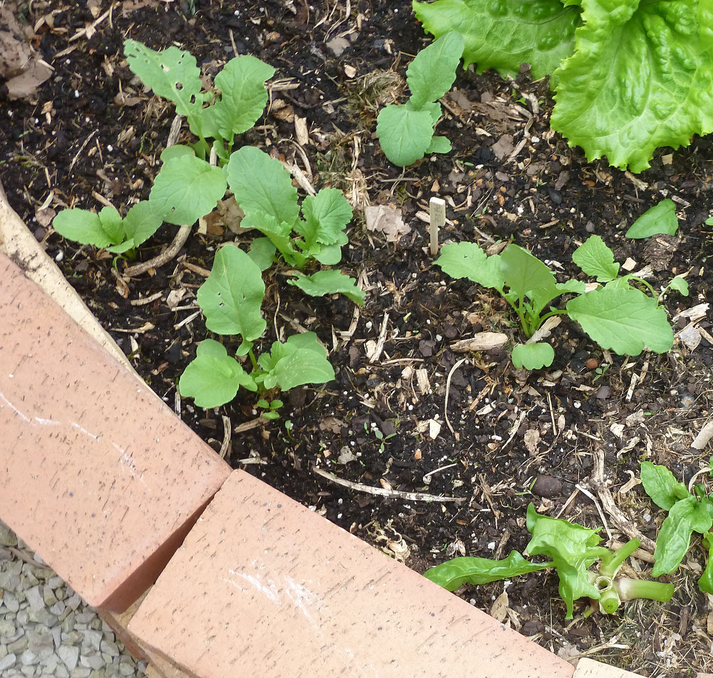 Des semis de radis, betteraves et haricots verts nains ont été réalisés directement en terre. Les radis ont relativement bien réussi. Toutefois, la fraicheur imprévue du mois d’avril, a contrarié la levée des betteraves et des haricots. En plus, un merle, qui gratte le paillage à la recherche d’insectes et de vers de terre, a dispersé façon puzzle les semis patiemment mis en place…