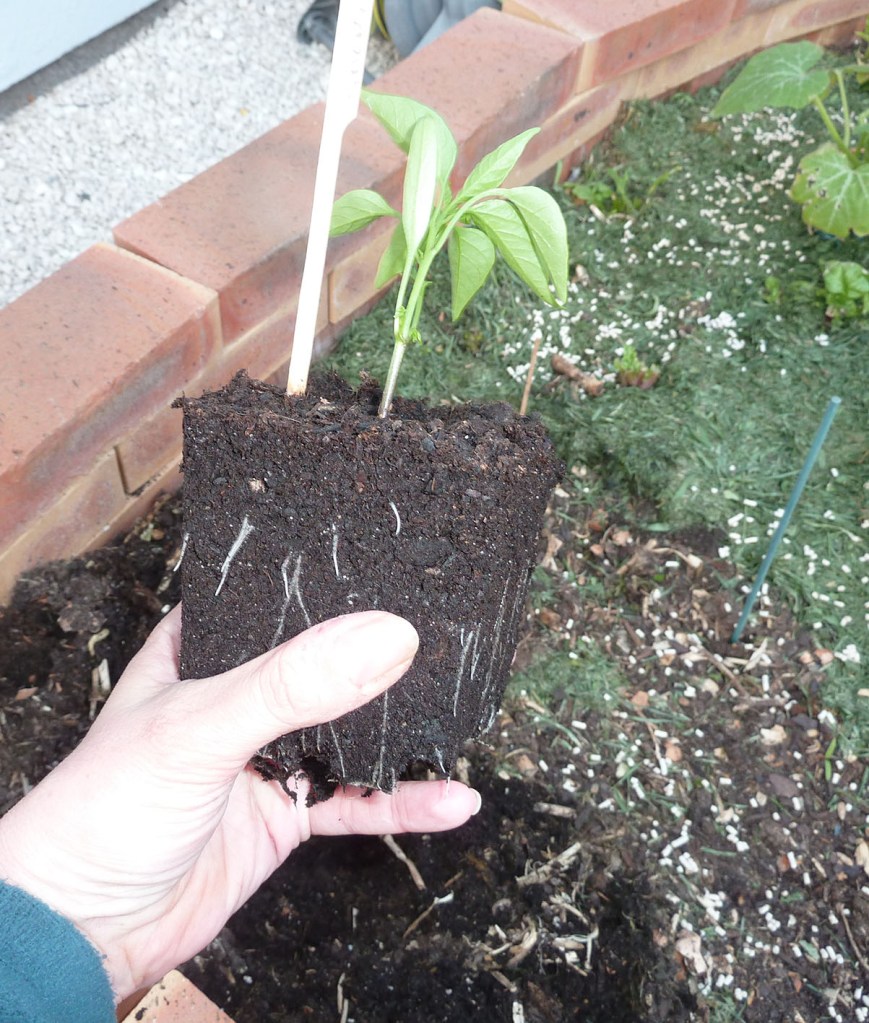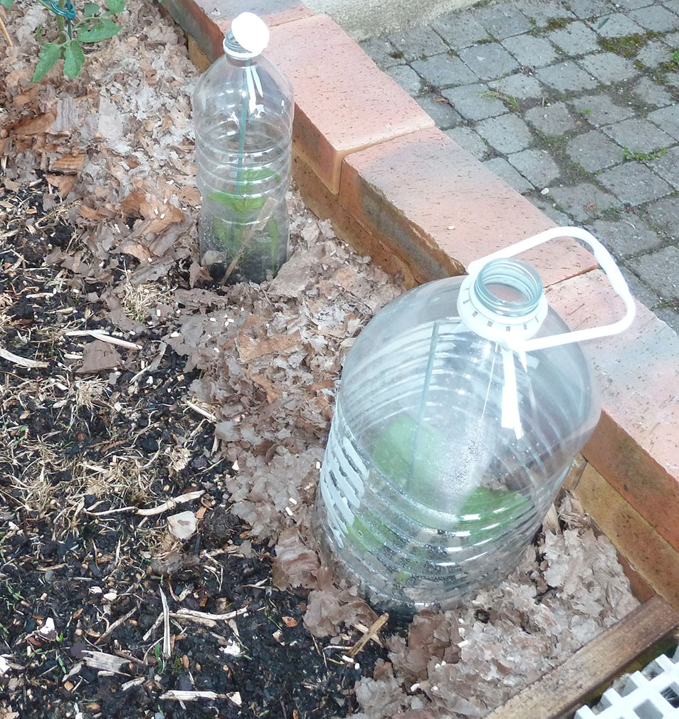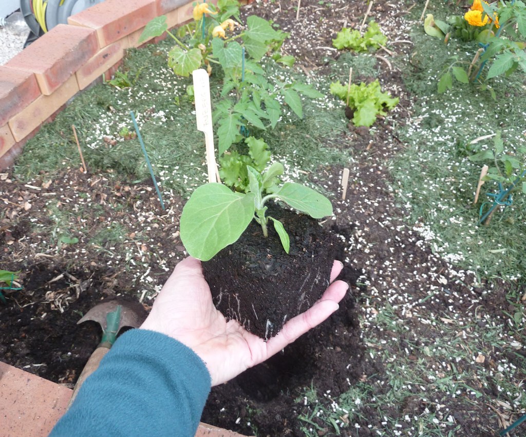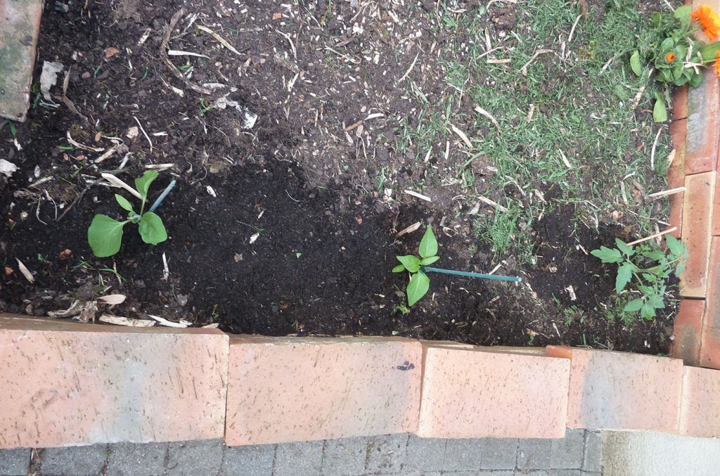 Les plants de poivrons, aubergines, piment et tomates cerise, plus lents dans leur développement, ont été laissés sous serre jusqu’au 8 avril, puis repiqués dans l’espace de culture. Les températures nocturnes de ce mois d’avril nous ont donné quelques frayeurs. Protégées par des bouteilles en plastique, du journal et des voiles d’hivernage, ils ont tout de même survécu au froid et accusent juste un retard de croissance.