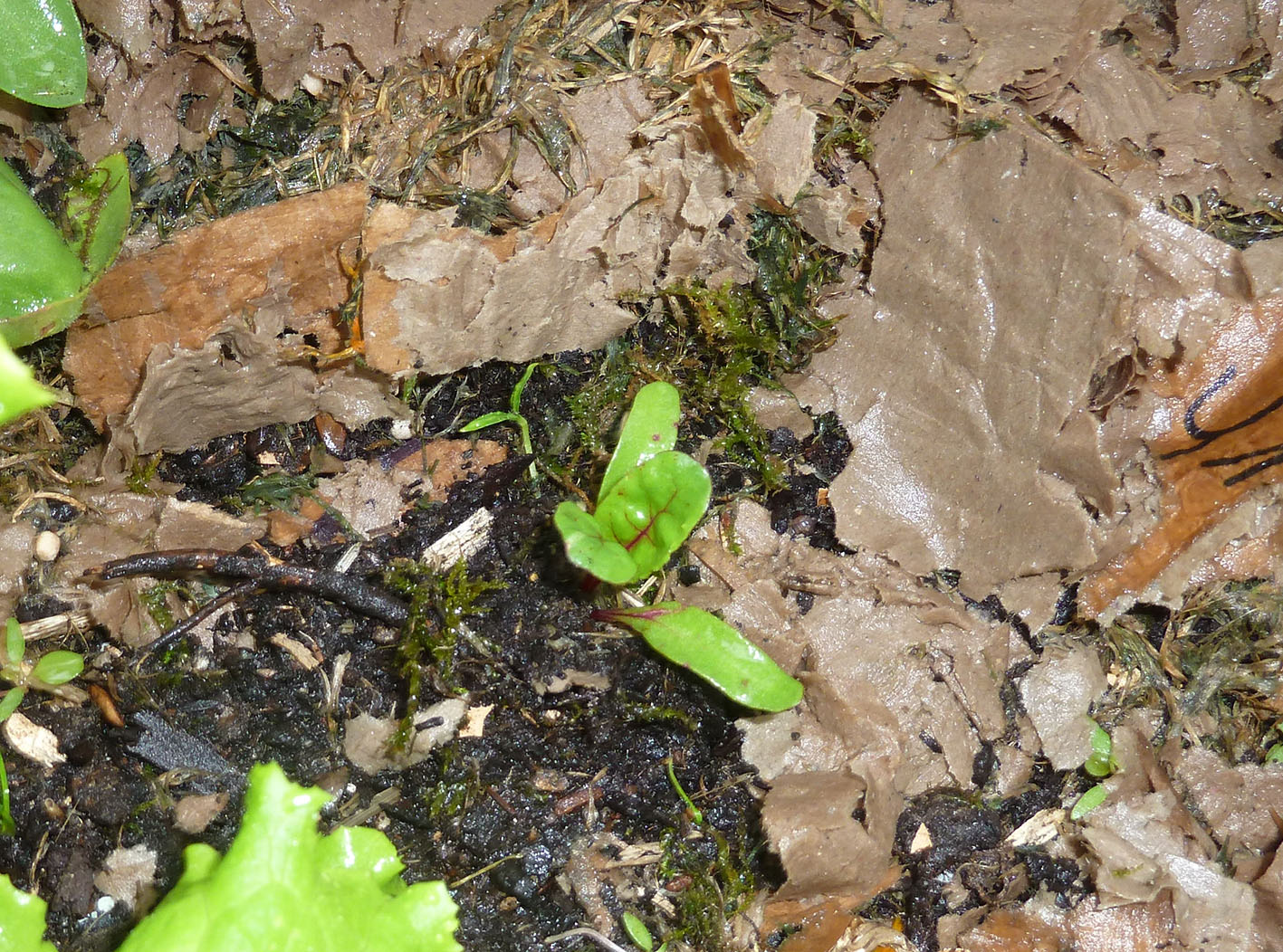 Une nouvelle stratégie de semis a été adoptée pour limiter la dispersion des graines par l’oiseau. Les betteraves sont semées en godets et seront mises en place lorsque les plants auront poussé de quelques centimètres. Le merle gratte autour des plantes mais ne les déterre pas (pour l’instant). Son grattage permet d’aérer le paillage et de biner naturellement le pourtour des plants. Les graines de haricot sont dispersées mais toujours présentes : nous allons attendre que les plantules apparaissent (ou pas). Les plants seront laissés en place sauf s’ils gênent une culture déjà implantée, auquel cas la plantule sera déplacée.