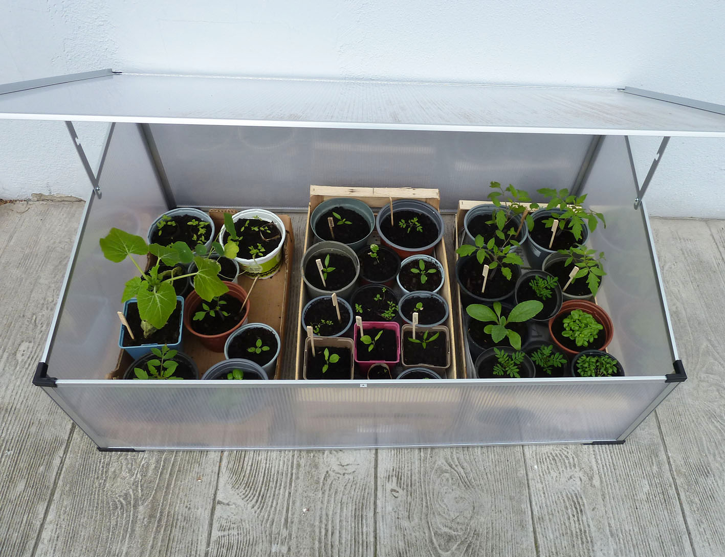 Comme certains plants commençaient à filer et surtout par manque de place dans la maison, nous les avons installés dans une petite serre froide, placée sur la terrasse et contre un mur de façade. Une luminosité plus importante et la chaleur douce de la serre ont accéléré la croissance des plants.