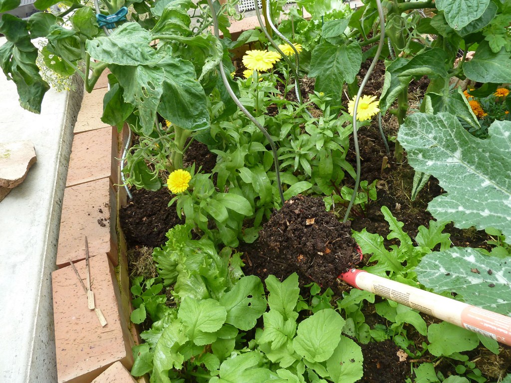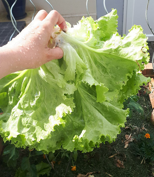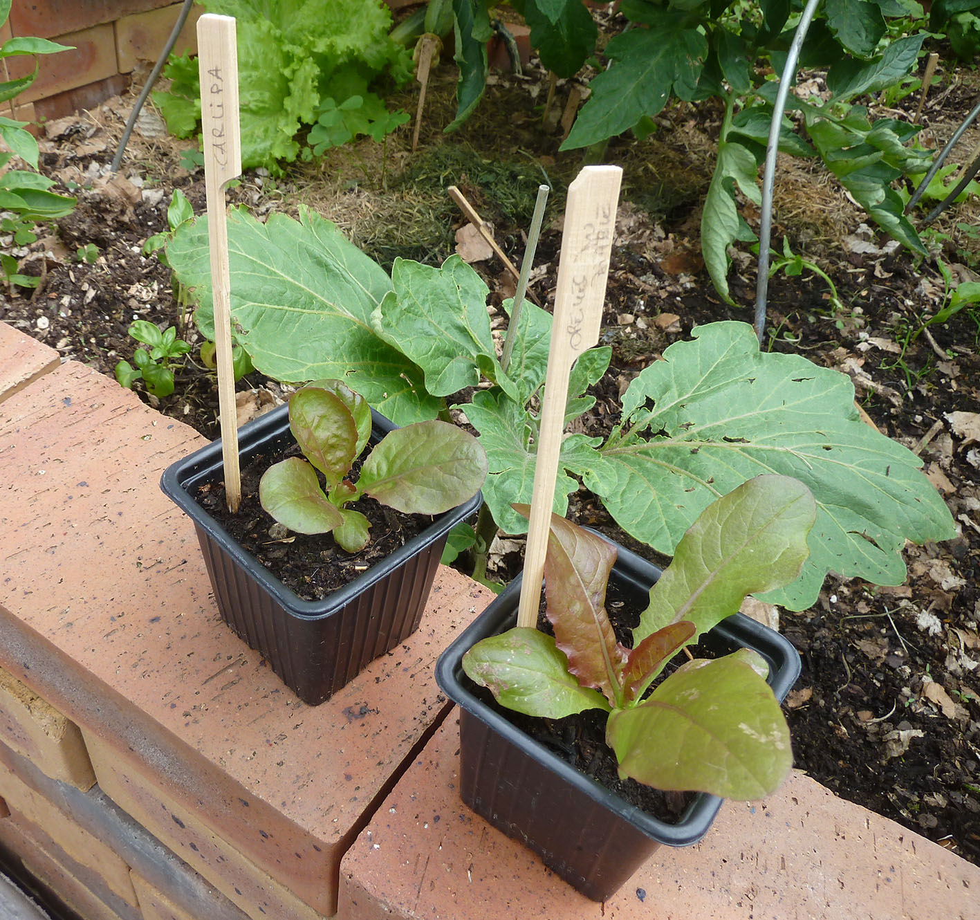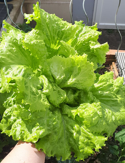 Mises en place dès l’apparition de quatre feuilles sur les plants, les laitues ont beaucoup apprécié les pluies et la fraicheur printanière. Des attaques de limaces et d’escargots ont ravagé plusieurs pieds : les plants survivants ont été préservés des gastéropodes avec des bouteilles plastiques retournées. De belles récoltes de laitues ont été réalisées avant l’arrivée de la chaleur de juillet.