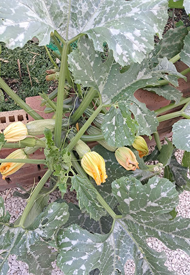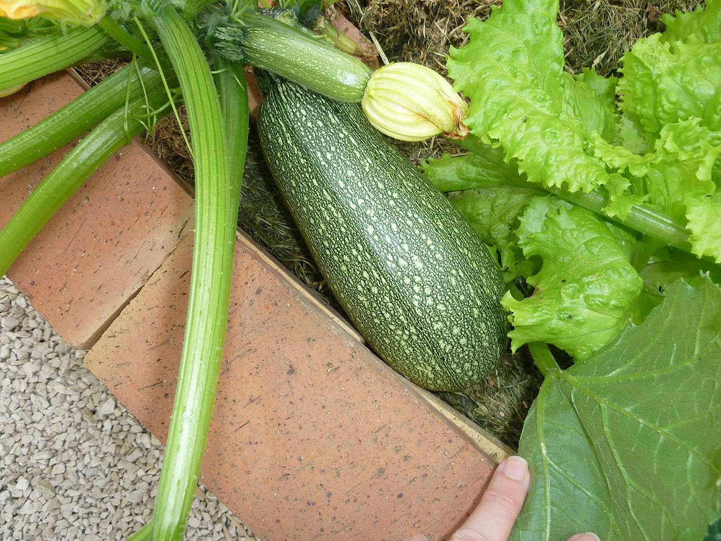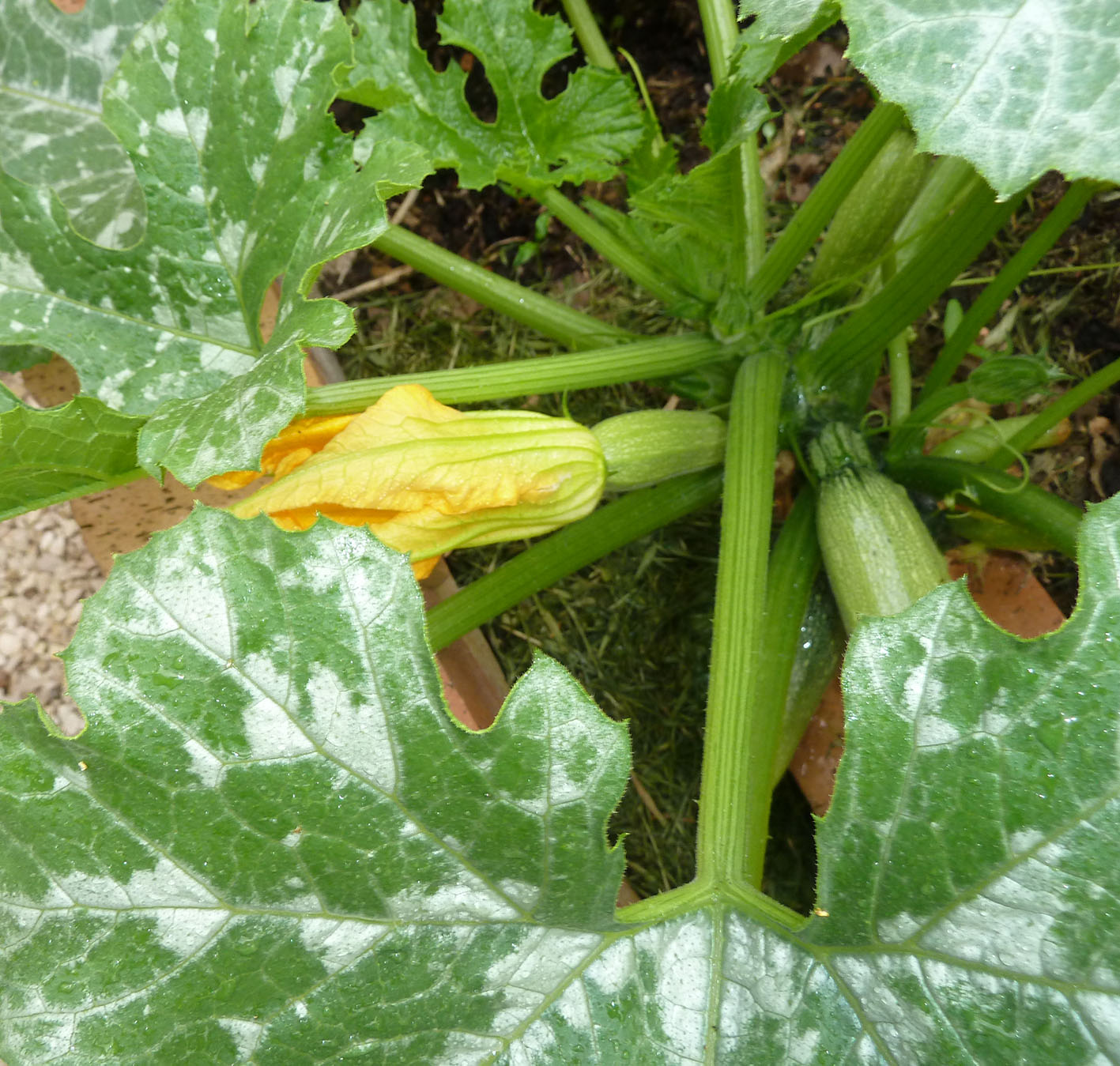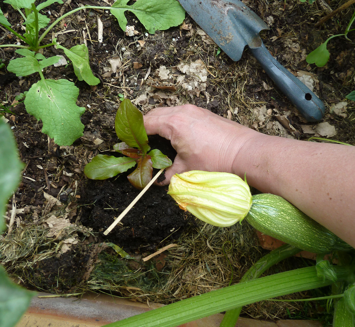 Début juin, les fortes pluies ont cessé et les fleurs mellifères installées aux alentours du micro potager attirent les insectes, favorisant la fécondation naturelle des courgettes.