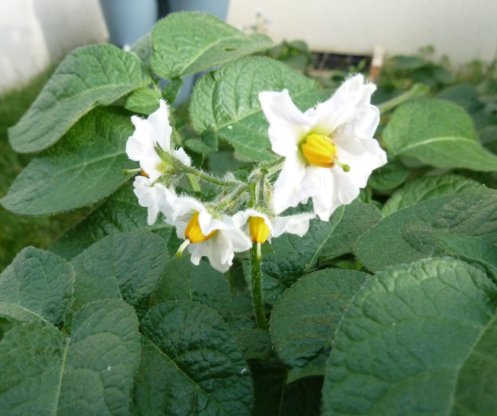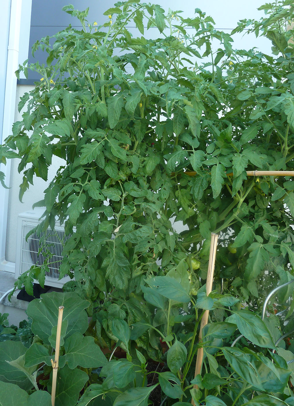 Repiqués dans le micro potager, les plants de tomates se sont rapidement épanouis malgré la pluie et le froid. Les troncs se sont renforcés et les premières grappes de fleurs sont apparues fin avril.