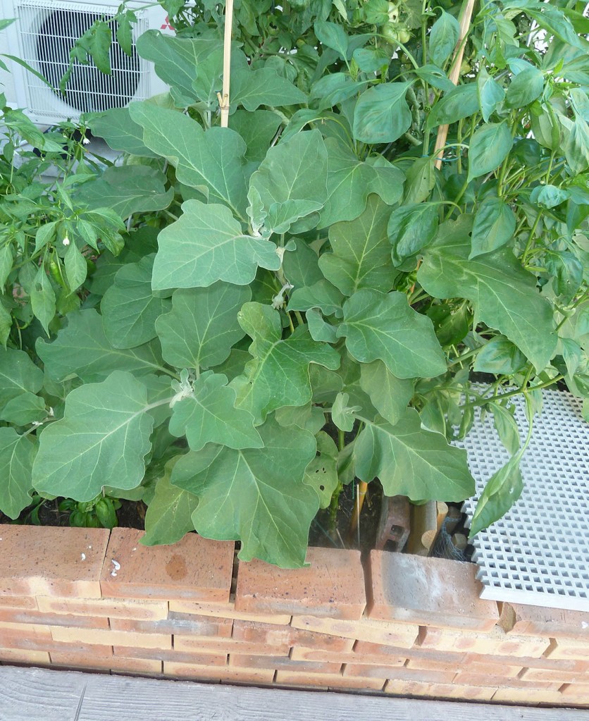 Mis en place à la mi-avril, les plants ont accusé un retard de croissance en raison des températures trop fraiches, en particulier la nuit. Fin mai, l’apport de compost associé à un mulch de tonte a accéléré la croissance des plants. Néanmoins, toutes les premières fleurs d’aubergines, poivrons et piments se sont desséchées et ont fini par tomber. Il est possible que les plants aient reçus trop d’azote, en particulier avec le mulch de plusieurs tontes et que cet excès d’azote ait entrainé l’avortement des fleurs. L’apport de purin de banane à deux semaines d’intervalle semble avoir relancé la floraison et favorisé l’apparition de fruits.