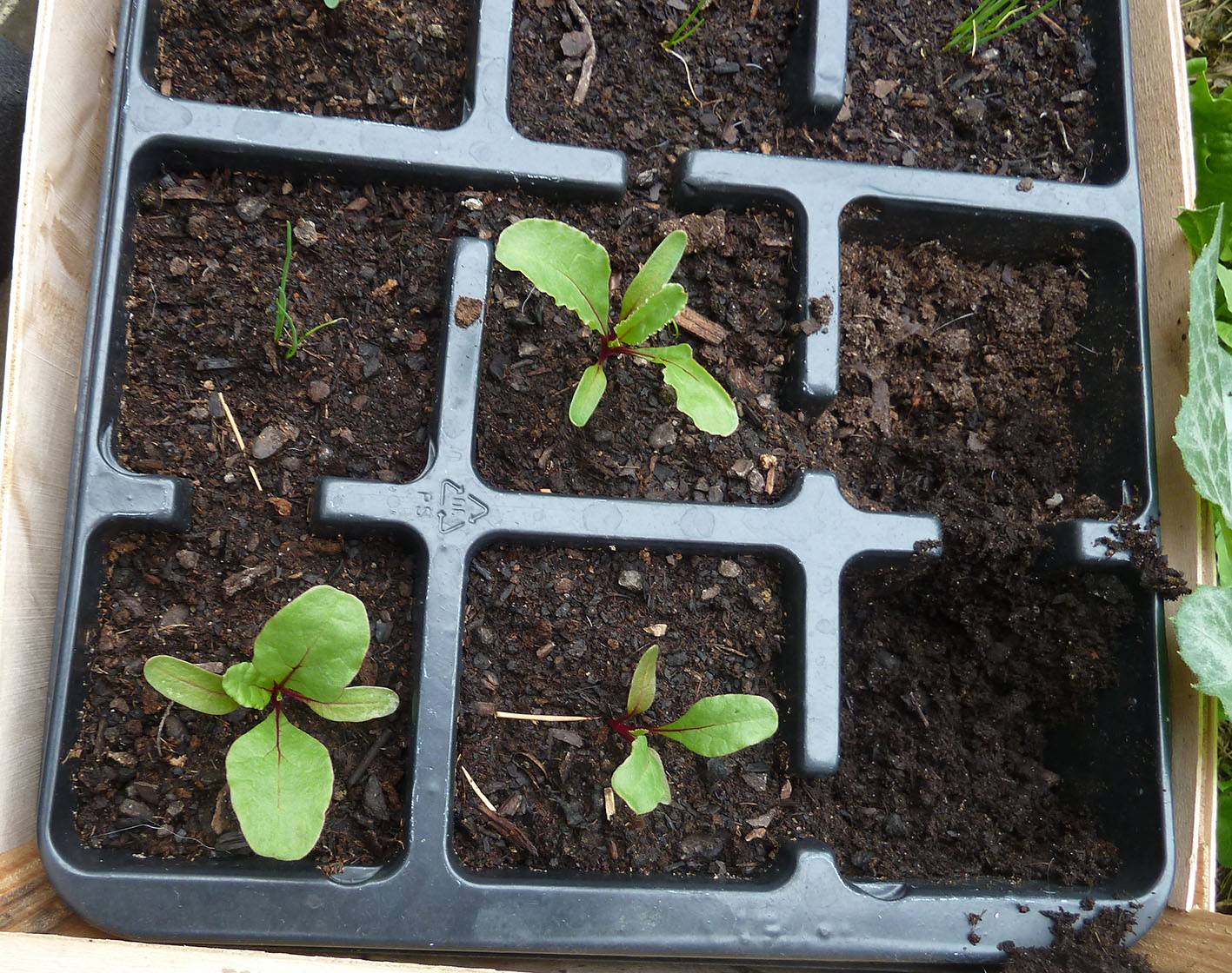 Cette année, la culture de betterave a été compliquée. Le semis directement en terre a été compromis, par les fortes pluies et par les merles qui, en grattant la terre, ont dispersé les graines. Les semis ont alors été réalisés en godets et les plants ont été repiqués en pleine terre. Les plants ont été déterrés par les oiseaux : aucune récolte n’aura lieu.