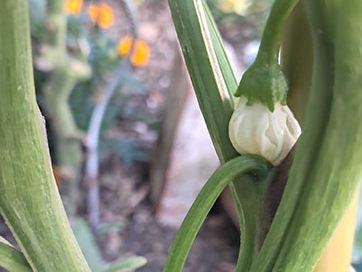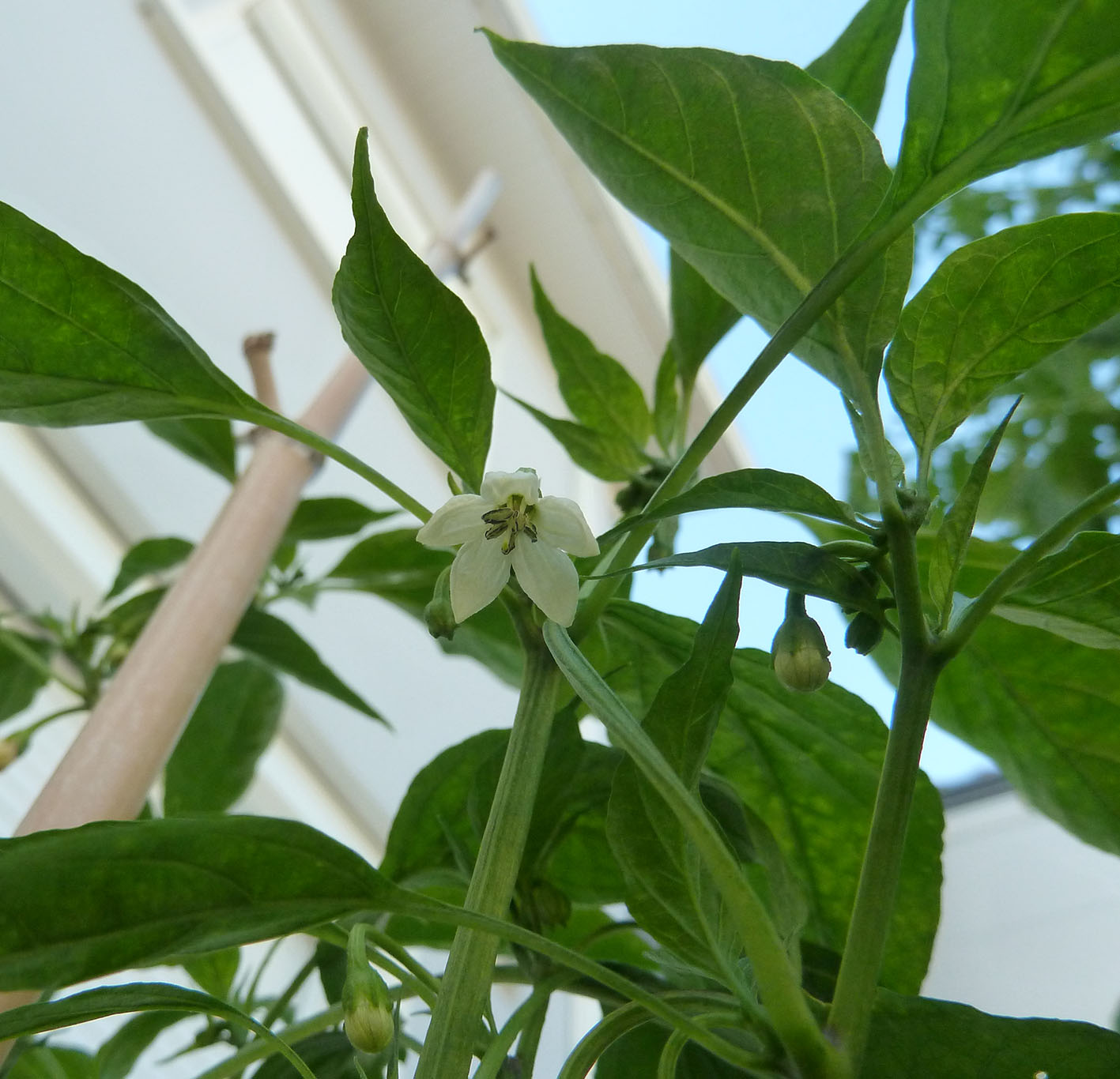 Comme pour les aubergines, la chaleur et l’amendement en purin de banane ont favorisé la floraison des piments de Cayenne. De nombreuses grappes sont apparues et devraient arriver à maturité fin août.