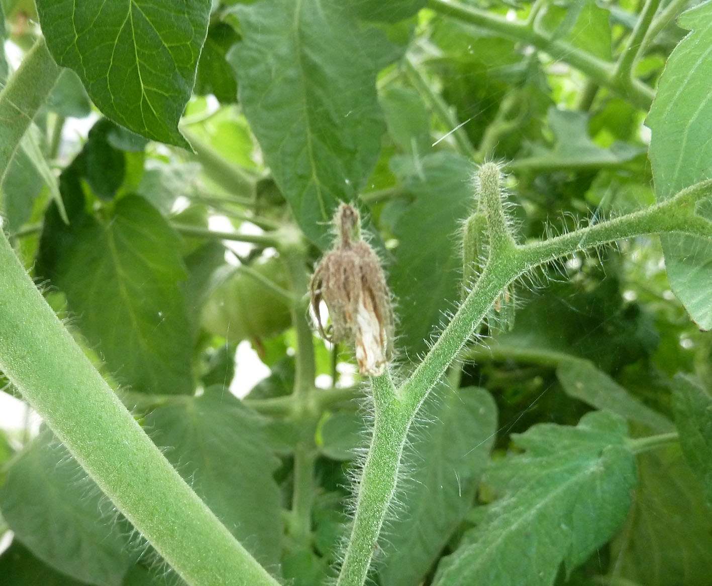 Cependant, plus de la moitié des fleurs des premières grappes a avorté. Il est très probable que les fleurs n’aient pas été fécondées. En effet, une fleur de tomate est hermaphrodite : les étamines porteuses de pollen sont disposées autour du stigmate, organe femelle de la fleur. En cas de pluies régulières, le pollen reste collé aux étamines et ne rentre pas en contact avec le stigmate. En l’absence de fécondation, la fleur fane, sèche et son pédoncule se détache de la tige. Il est recommandé de secouer légèrement les fleurs ou de les pincer délicatement afin que la fécondation ait lieu.