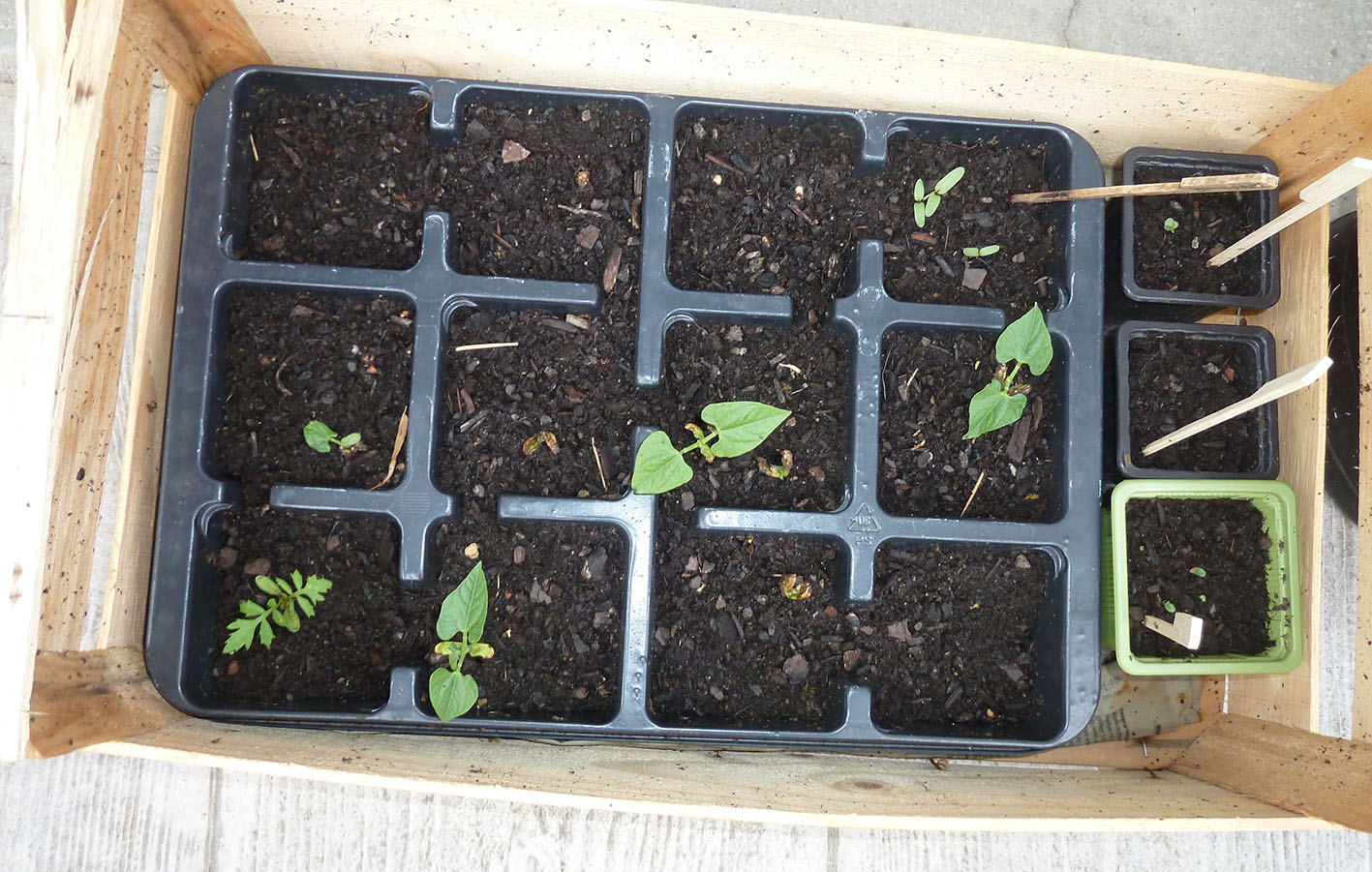 Comme pour les betteraves, les graines de haricot verts placées directement en terre n’ont pas germé ou ont été dispersées par les oiseaux. Les semis réalisés en pots, sont laborieusement sortis de terre. Une fois repiqués, les merles se sont chargés de disperser les jeunes plants. Pas de récolte de haricots verts cet été. Un nouveau semis sera réalisé fin août, en espérant une récolte en octobre…