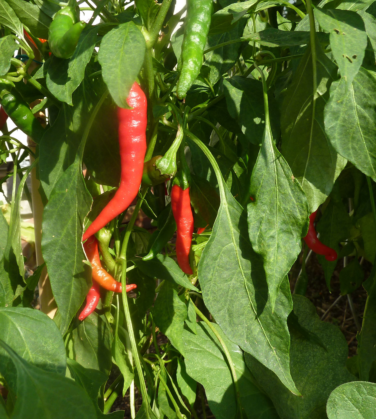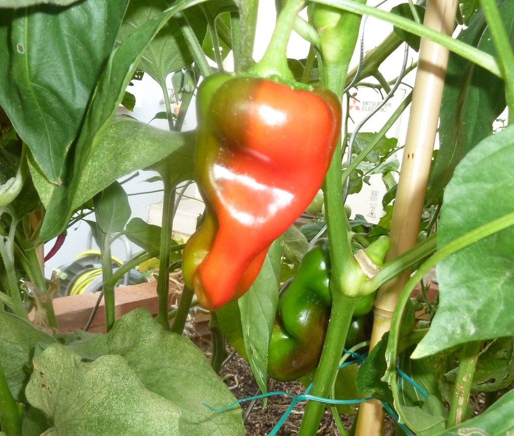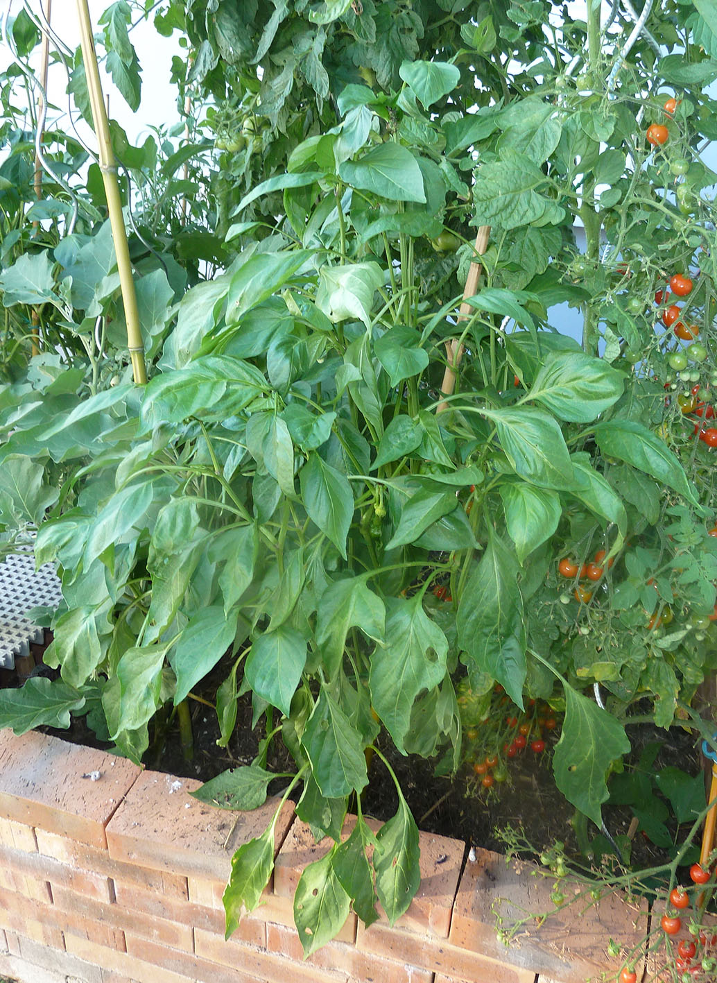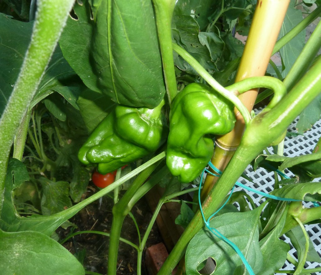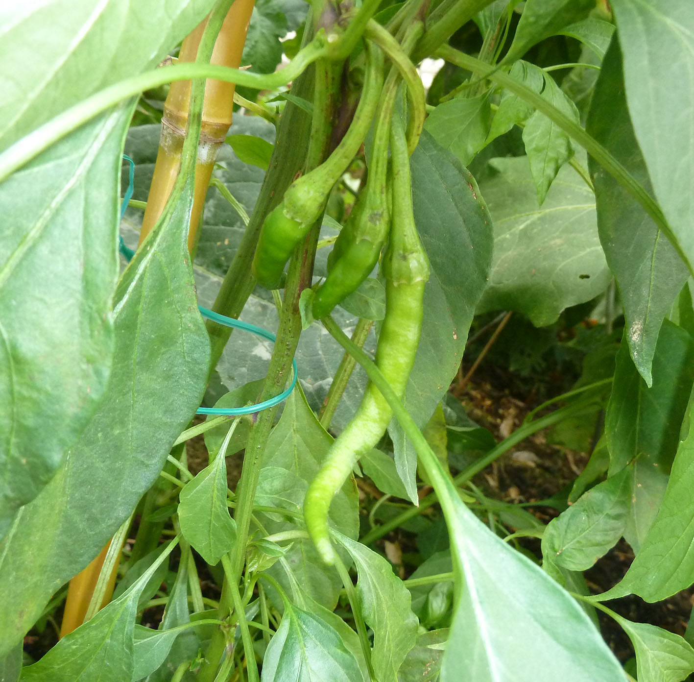 Le poivron apprécie particulièrement la chaleur. La croissance des fruits est en retard, par rapport aux aubergines et piments de Cayenne, mais on compte quand même 10 à 15 fruits formés par pied. Ils arriveront à maturité fin août.
