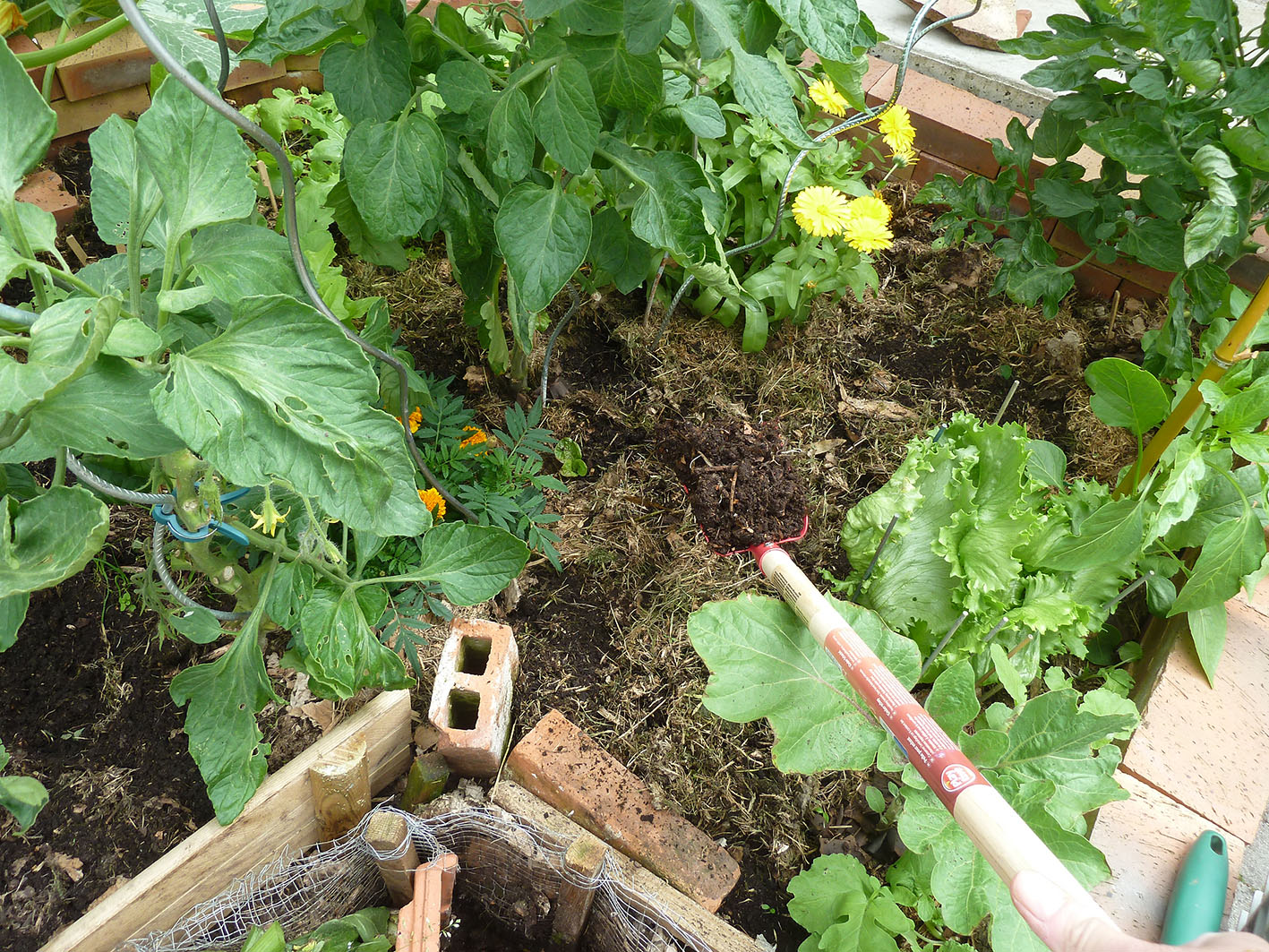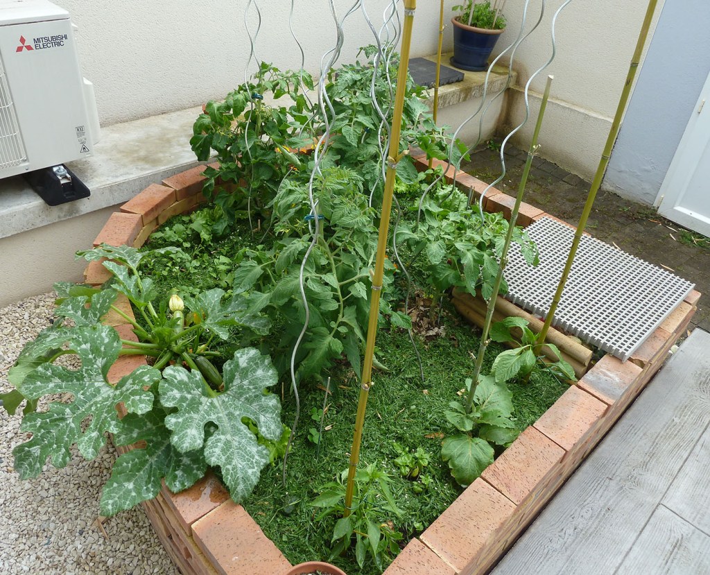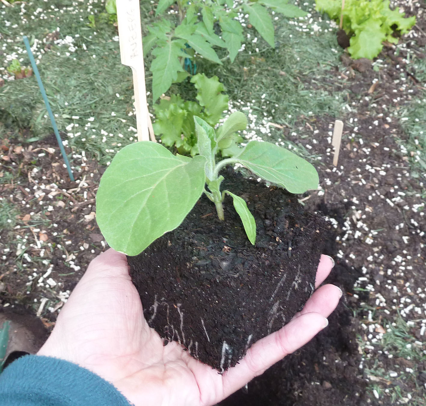 Lorsque vos plants ont atteint une quinzaine de centimètres (5 à 6 feuilles), transplantez les dans votre micro potager à un emplacement où les autres plants une fois grands ne leur feront pas d’ombre. Pour ce faire, creusez un trou de la taille du pot contenant votre pied d’aubergine. Dépotez votre plant sans en briser la motte et implantez le dans le trou. Formez une cuvette au pied du plant et arrosez généreusement sans mouiller les feuilles. Paillez le pied avec du mulch (tonte, cartons, paille)