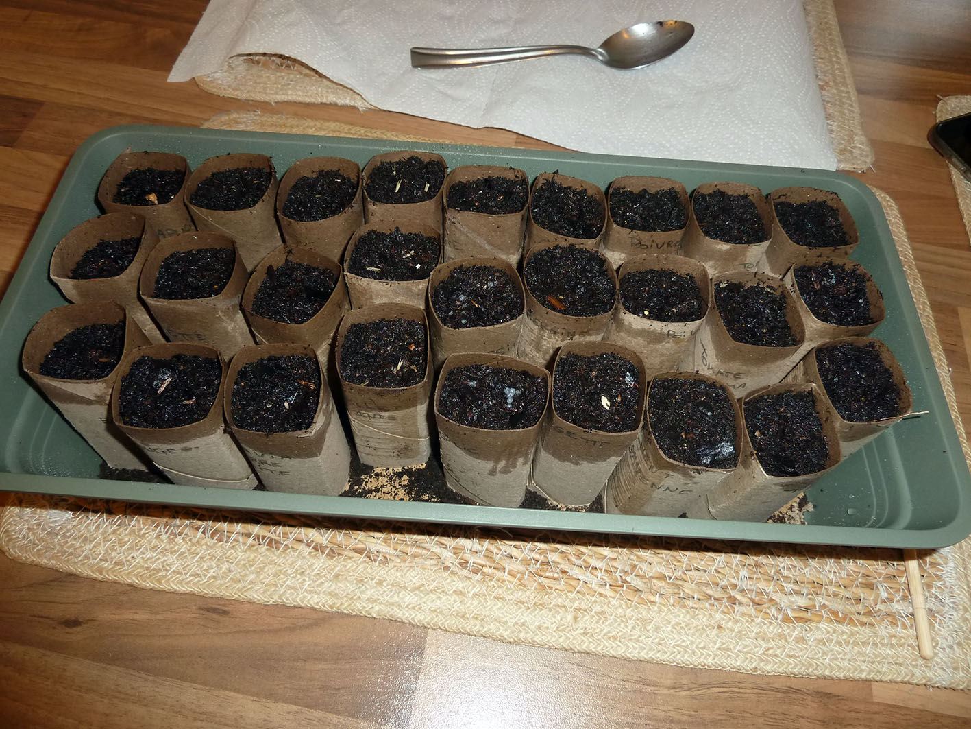 Remplissez un tube en carton (type rouleau d’essuie recoupé à bonne hauteur), de terreau à semis. Semez-y vos graines par 3 à 4 unités pour un plant.