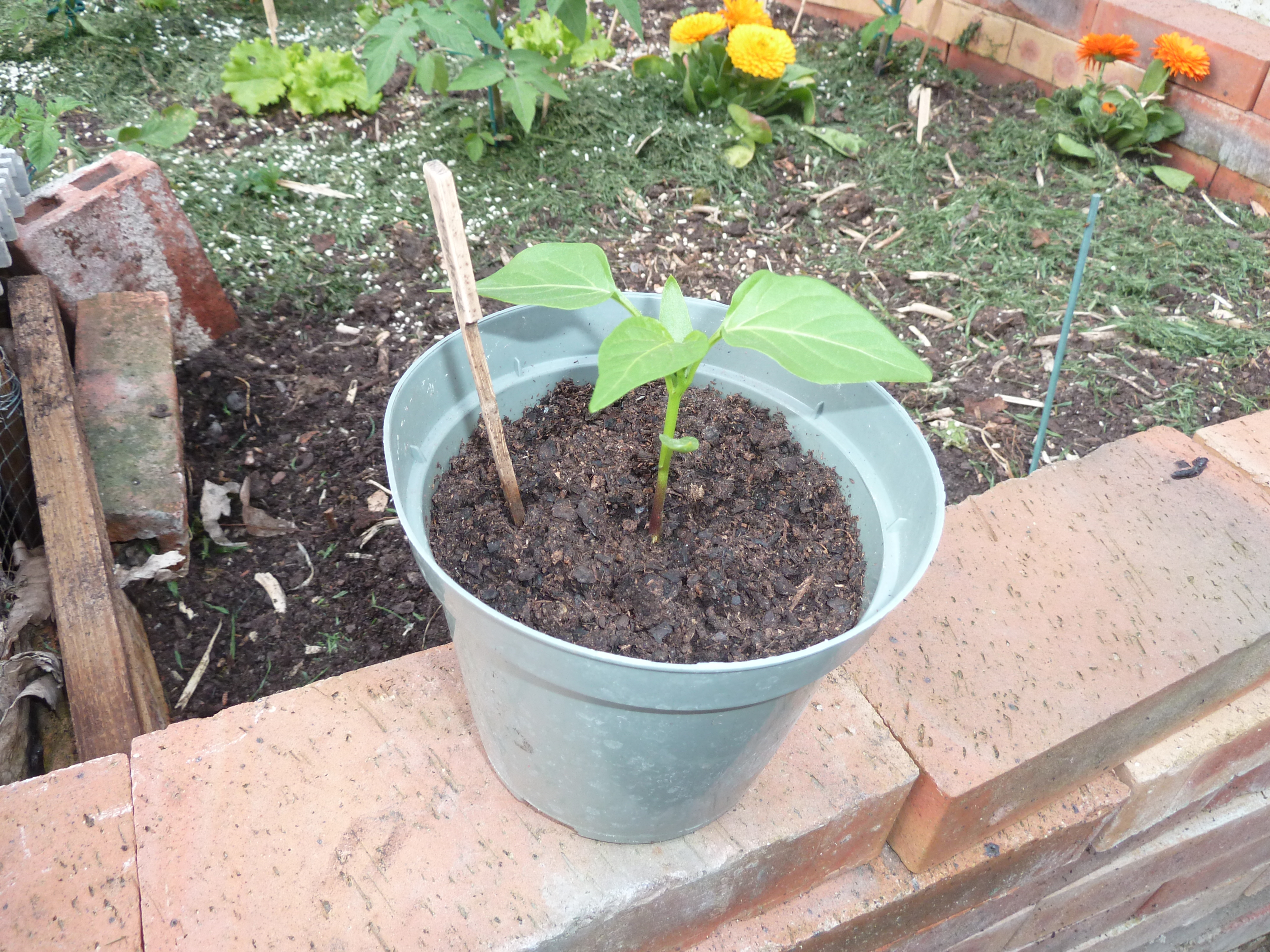 Les piments et poivrons se cultivent en pot : prévoyez un contenant d’environ 30 cm de diamètre et 40 cm de haut. Dans votre micro potager, le pied de poivrons atteindra 60 à 70 cm environ. Pour éviter qu’il ne casse sous un coup de vent, attachez le à un tuteur. Si les nuits sont encore fraiches (moins de 12°C), il vaut mieux protéger votre plant : une bouteille en plastique peut faire l’affaire, en servant de serre.