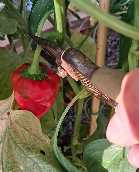 Les piments et poivrons se cueillent à maturité lorsqu’ils sont bien rouges. Lors de la récolte, ne les arrachez pas mais coupez-les pédoncules avec un sécateur.